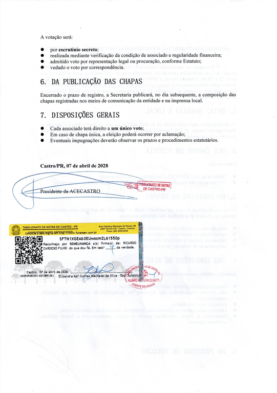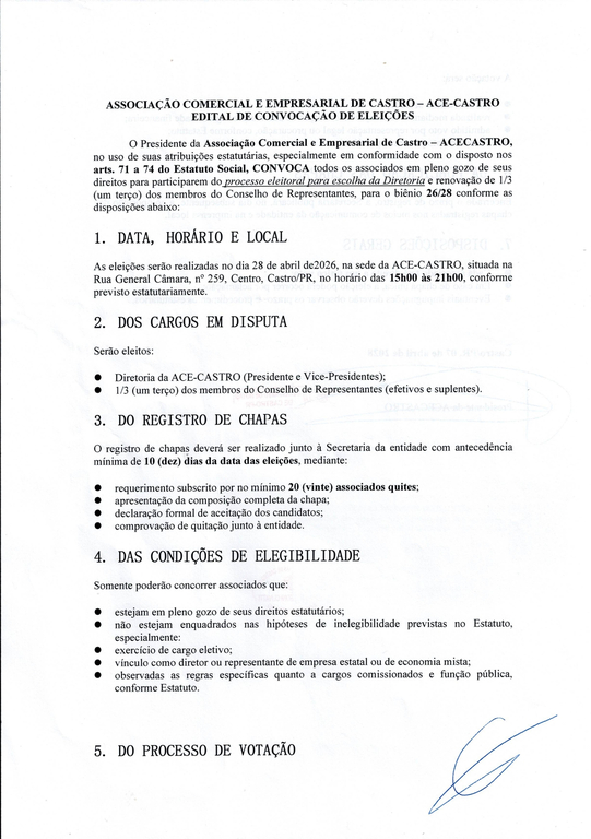 O Presidente da Associação Comercial e Empresarial de Castro – ACECASTRO, Sr. Ricardo Cardoso Filho, no uso de suas atribuições estatutárias, convoca todos os associados em pleno gozo de seus direitos para participarem do processo eleitoral para escolha da Diretoria e renovação de 1/3 dos membros do Conselho de Representantes, para o biênio 2026/2028.